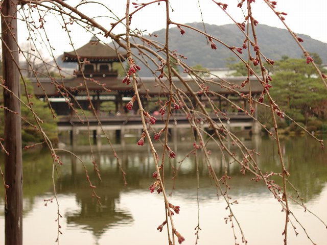 平安神宮の神苑では、遅咲きの梅が少し咲いており、とても美しかったです。