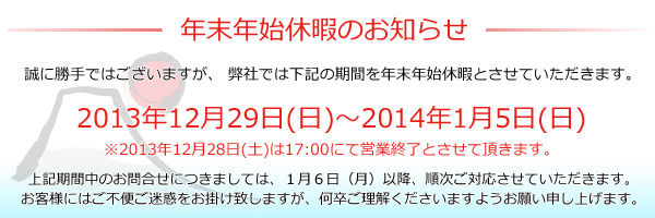 弊社は明日、2013年12月29日(日)より2014年1月5日(日)まで、年末年始休暇とさせて頂きます。