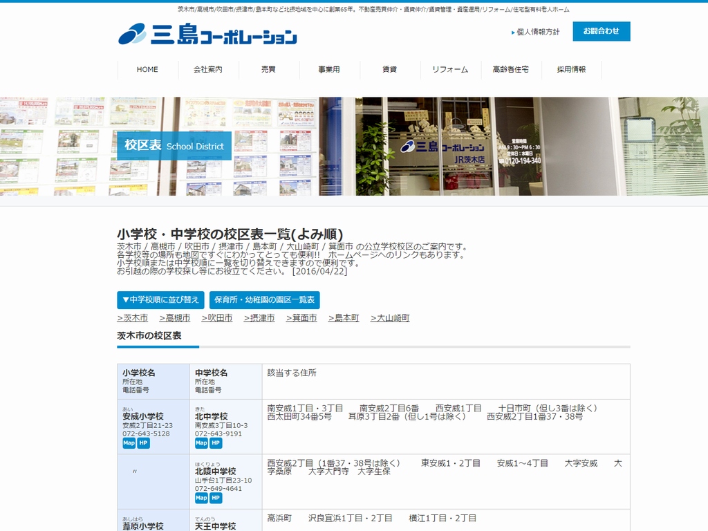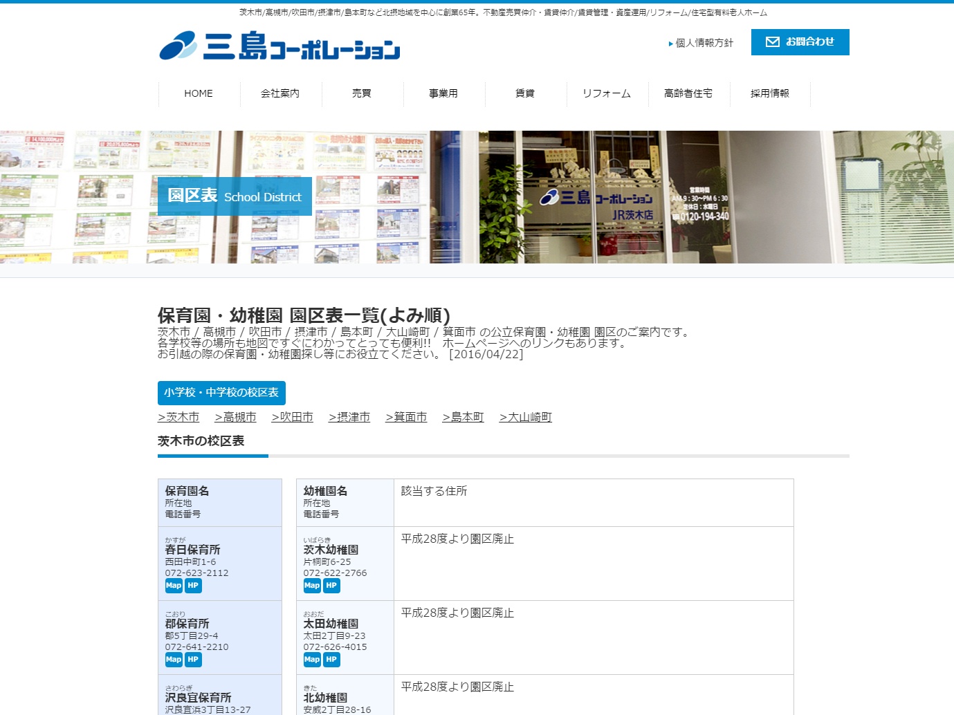 HOME > 未分類 > 三島コーポレーション公式サイトが一部新しくなりました 投稿日:2016年4月23日 土曜日 -宣伝広告 このたび、三島コーポレーション公式サイトのコンテンツの一部をリニューアルいたしました! ぜひご利用ください。 校区表と園区表が最新の内容で、スマートなデザインで文字も大きくスマートフォンでも読みやすくなりました。※スマートフォンは横向き推奨校区表では、小学校と中学校の関係が分かりづらい面があったため、サイト上で小学校順と中学校順で並び替えが出来るようになりました。学校も探しやすいようによみ順になっています。また、各施設のサイトも可能な限り調べてリンクいたしました。 売買に関する手順とよくあるご質問についてのページをポップに読みやすくなりました。新しくなったページのは次のとおりです。ご購入 / ご売却 / 買い替え / 買い取りよくあるご質問もたくさん掲載してございます。 (松浦) 売買リニューアルページ(ご購入) 校区表 園区表 -宣伝広告