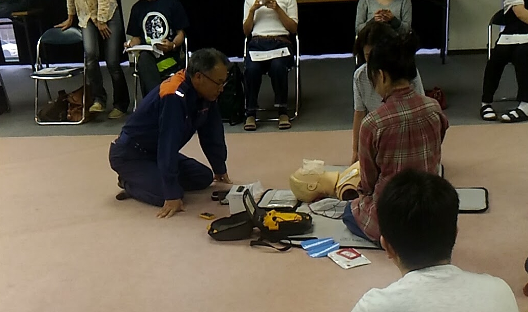 - 倒れた人が大人である場合を想定して、心肺蘇生やAEDの使い方などを学びます。3時間のコースです。
