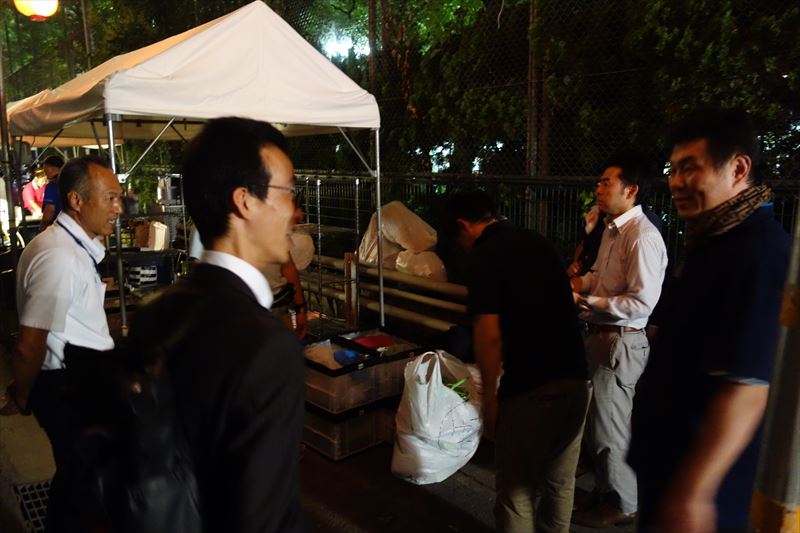 そして、現場片付けと清掃を終えて撤収を待つ男達。大勢のお子様にご来場いただいた嬉しさと同時に、そのエネルギーからの開放感でみんな笑顔です(笑)