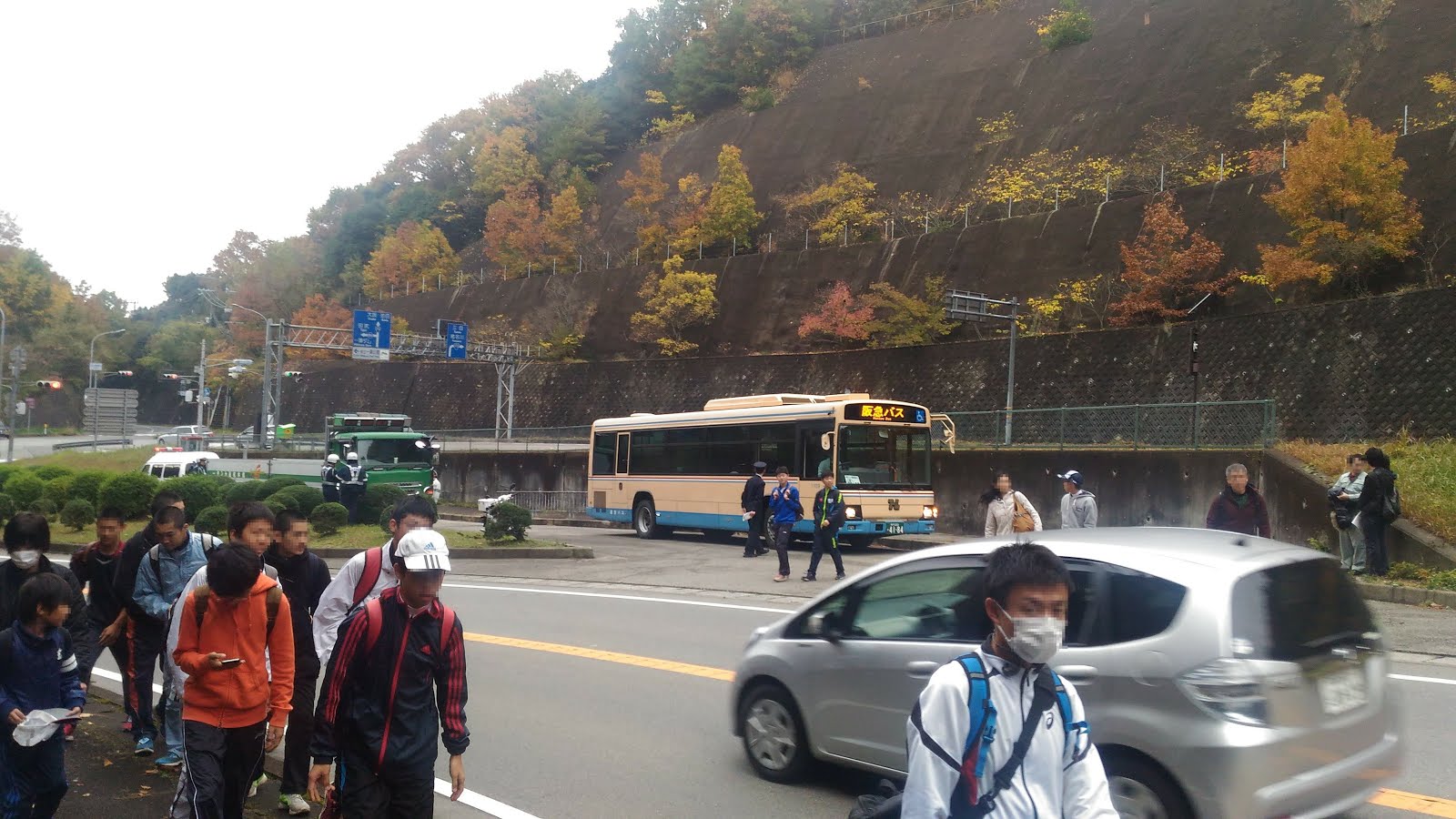 バスを降りたらちょっとだけ皆で歩いて一庫ダム管理事務所に集まります。