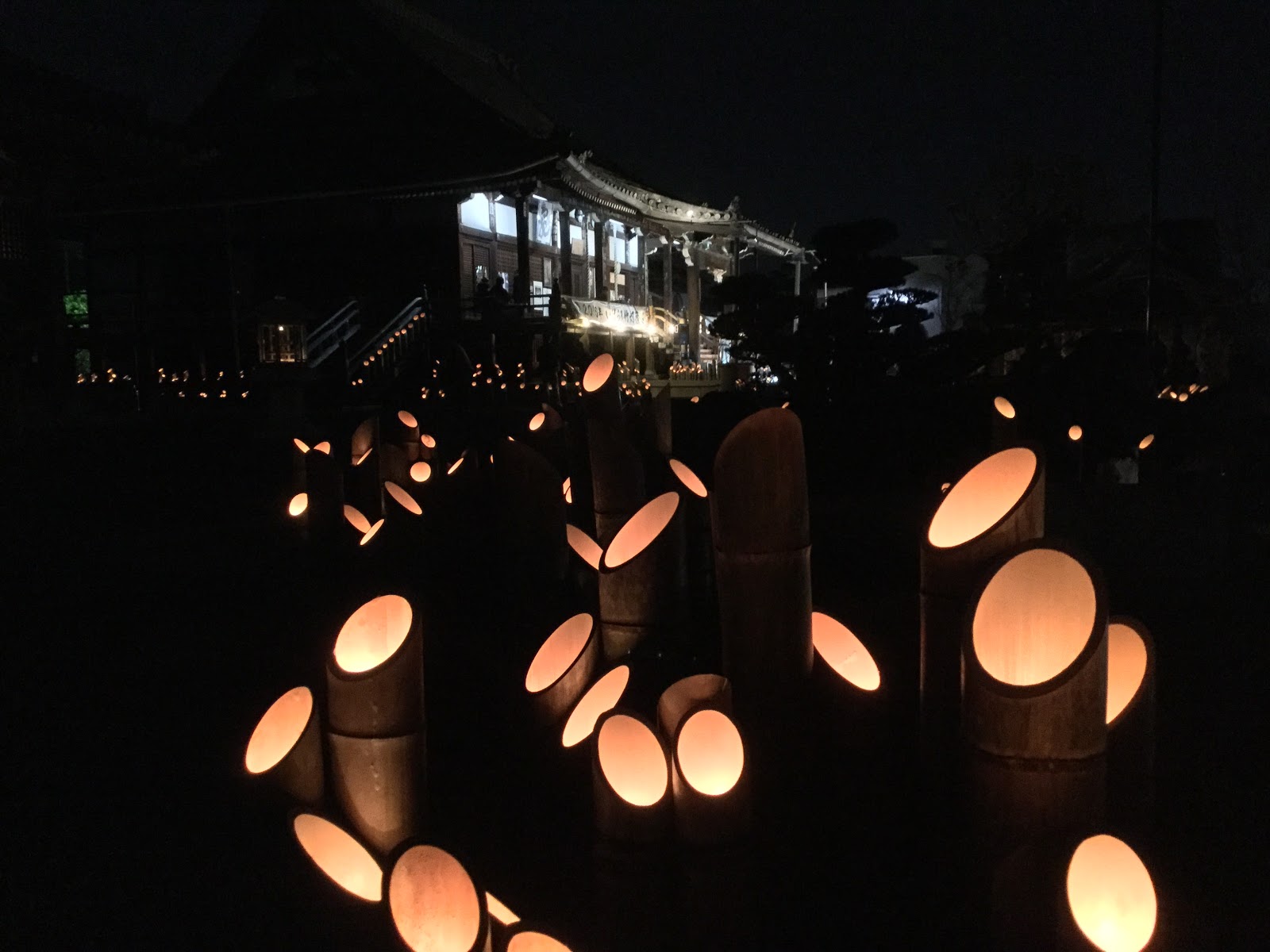 お寺と竹灯籠が醸し出す、幻想的な雰囲気。
